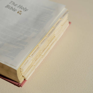 Our Linen Bible Tabs are intentionally designed to help you navigate the books of the Bible while adding a sophisticated, elegant touch. Each tab is double-sided and crafted from deluxe linen paper with gold-foiled lettering for a timeless, heirloom-quality finish.